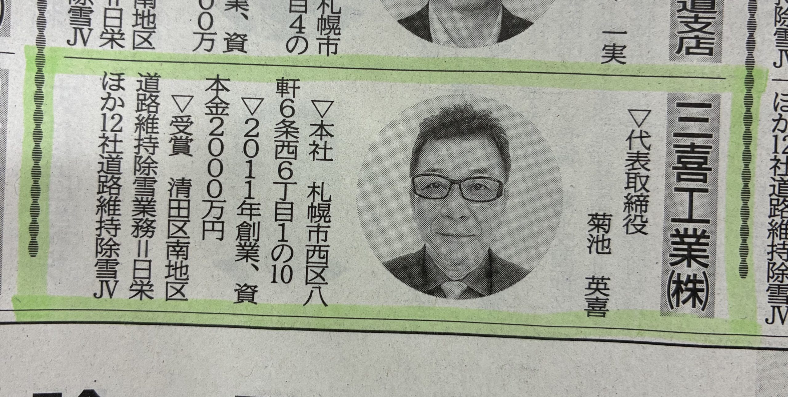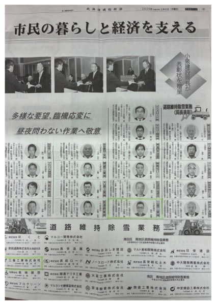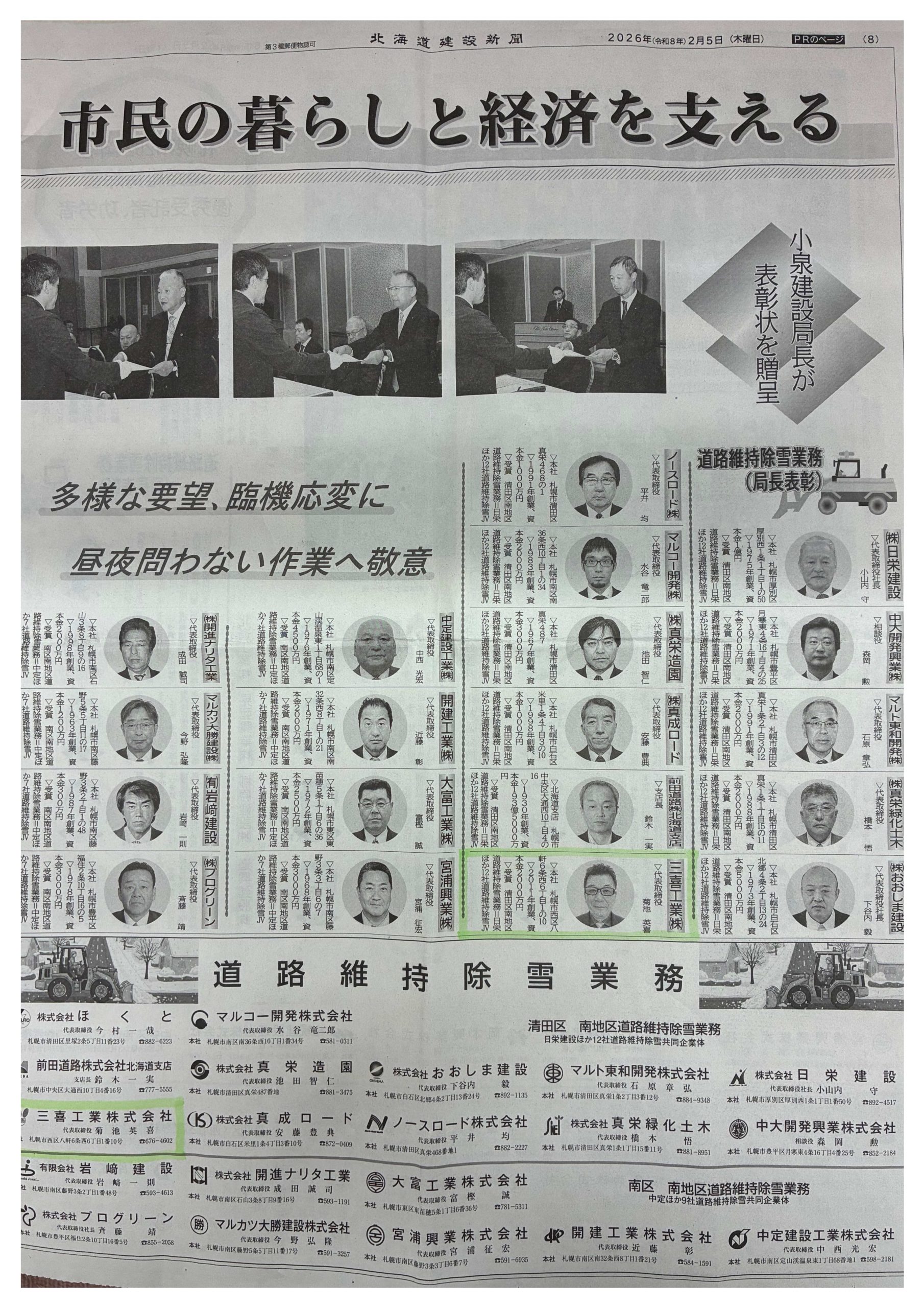 道路維持除雪業務 Posted on 2026/02/12 2月5日の建設新聞に掲載されました! 小泉建設局長から表彰状を贈呈されました。 サンキは、清田区南地区の除雪業務をしています。 今年の大雪で、昼夜問わず作業している方はかなり大変だと思いますが、 頑張っていただき、ありがとうございます!